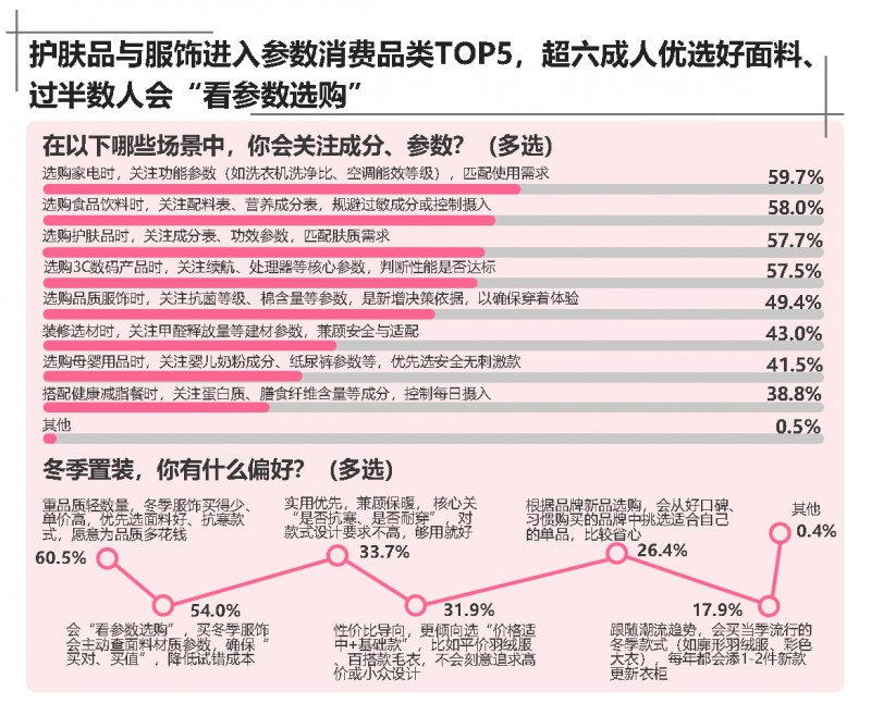 从美妆护肤的成分关注,到服饰消费的参数考量,一场覆盖全品类的“理性消费革命”正在上演。调研数据显示,相比两年前,有93.6%的消费者表示自己更加关注服装的面料材质参数,其中48.6%的人认为,不同面料有肤感、质感、功能性的区别,12.8%的人认可面料是文化或品牌代表,10.8%的人觉得关注面料材质参数能帮助决策。超七成消费者认可选购冬季服饰时关注参数的重要性,79.7%的人购买冬季保暖外套(羽绒服、大衣)时,会重点看羽绒服克重、绒子含量和大衣的羊毛含量,64.1%的人选购贴身衣物时,会关注含棉率、抗菌率和弹力系数。这种场景化的参数关注,让消费决策更精准,也意味着聚焦商品功能本质的理性消费趋势渐起。