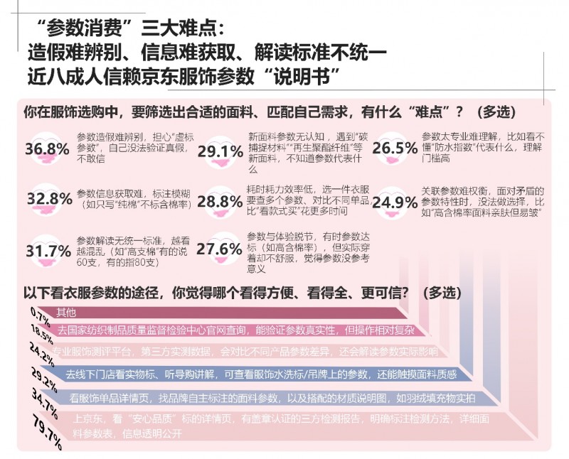 在追求品质服饰的过程中,消费者对平台的选择愈发谨慎。调研显示,78.1%的消费者认为在京东能买到“面料有把关、一分钱一分货”的品质服装。这一优势的背后,是京东通过多年来在参数选品领域的用户心智,以精细打磨、苛求品质的“理工思维”获得了消费者信任。