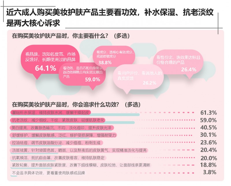 消费者的理性消费已经深入决策的每一环节。购买护肤产品,64.1%的人会优先选择知名度高、市场反馈好的品牌,59%的人会根据自身需求挑选功效明确且有实测支撑的产品。当前,基础补水保湿(61.3%)、抗老淡纹(59%)是大家购买护肤品的两大核心追求功效。