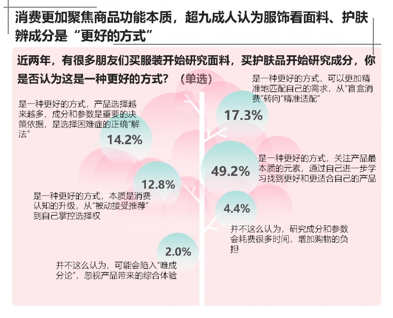 调研中,对于近两年更多人在购买服饰时研究面料、购买护肤品时研究成分/功效,有93.5%的受访者认为是一种更好的消费方式,其中49.2%的人表示,消费就要“关注产品最本质的元素”,17.3%的人表示这种消费可以精准匹配自己需求;14.2%的人指出,成分和参数是重要的决策依据。可见,越来越多的消费者开始主动关注商品本身的价值。